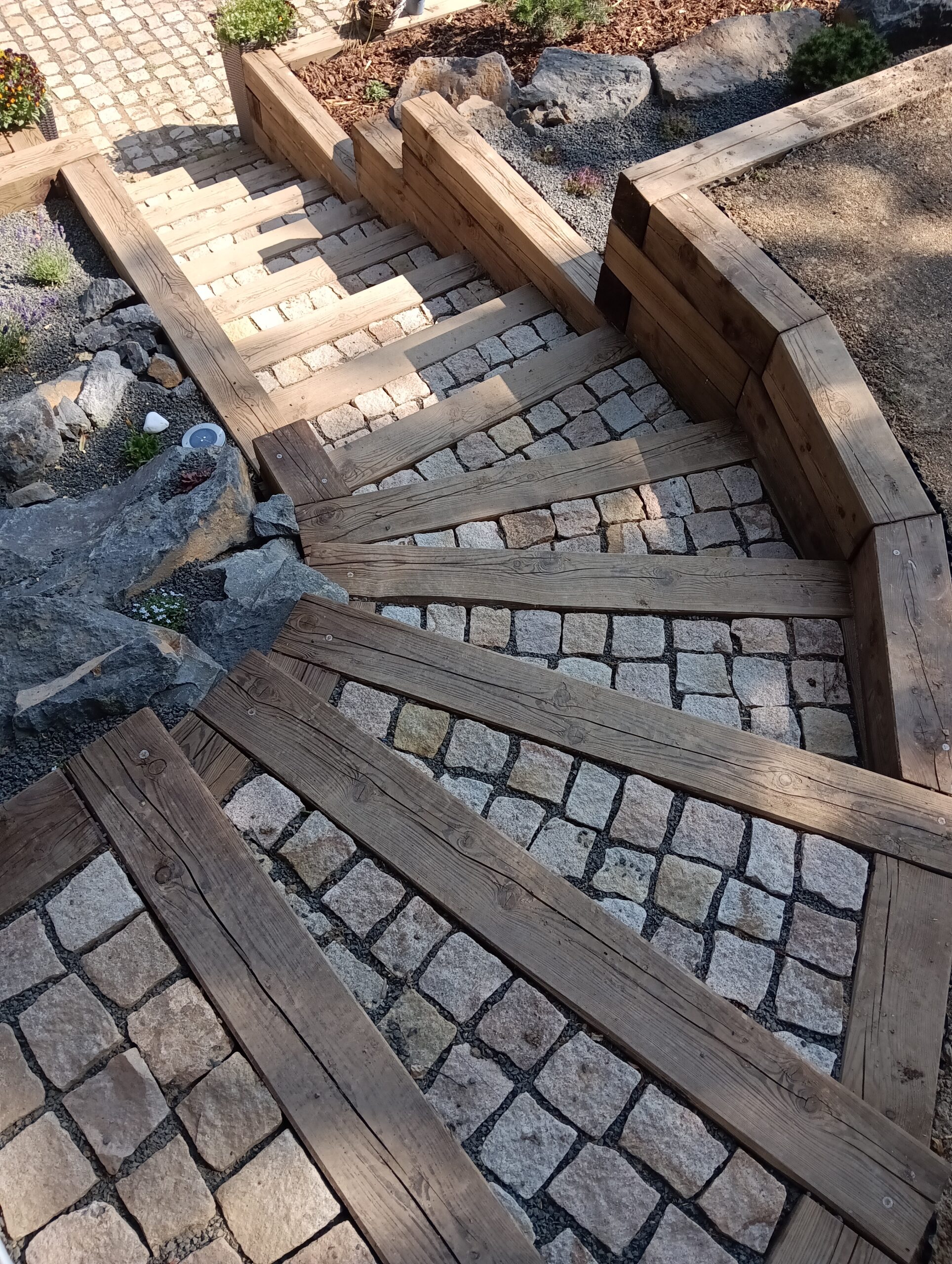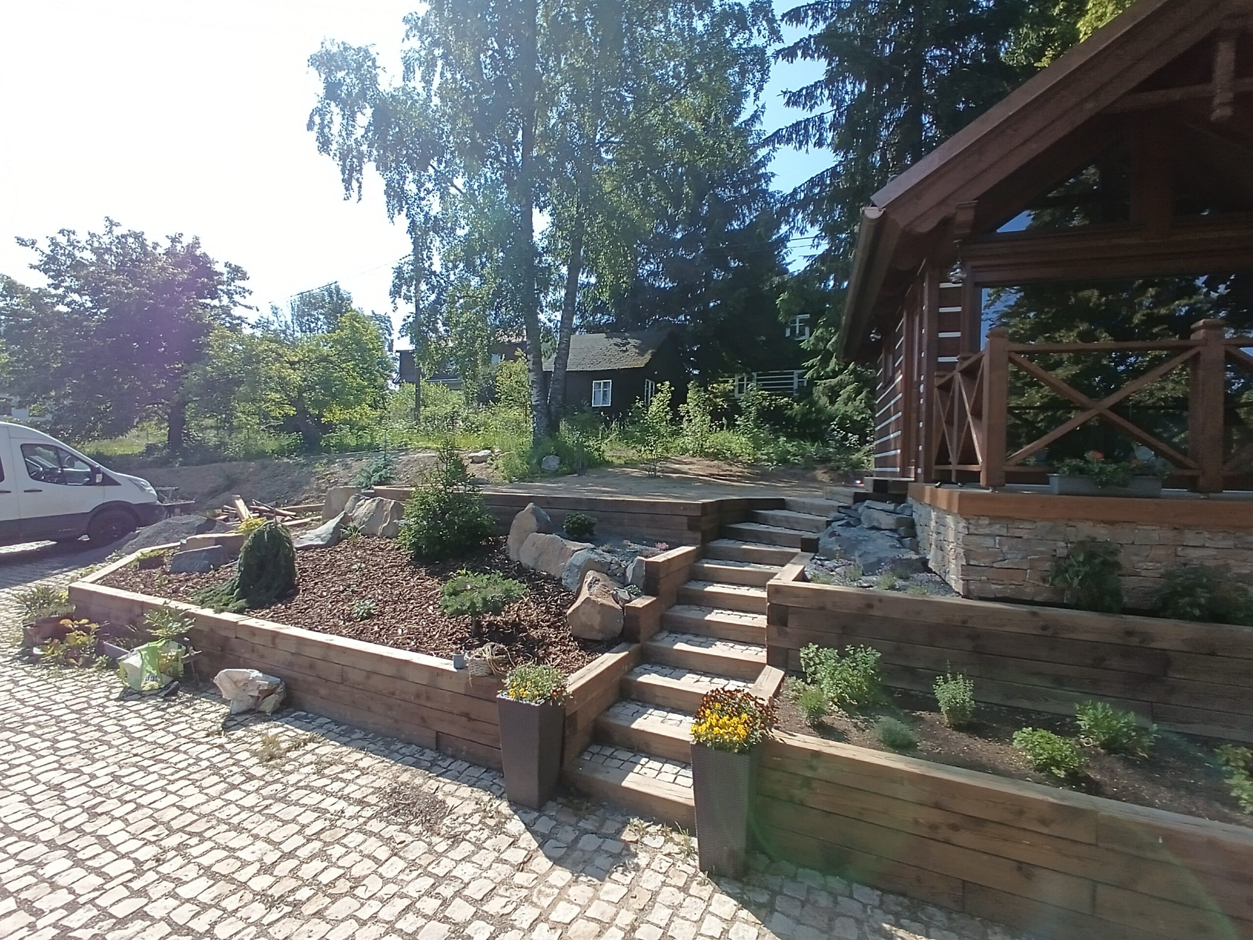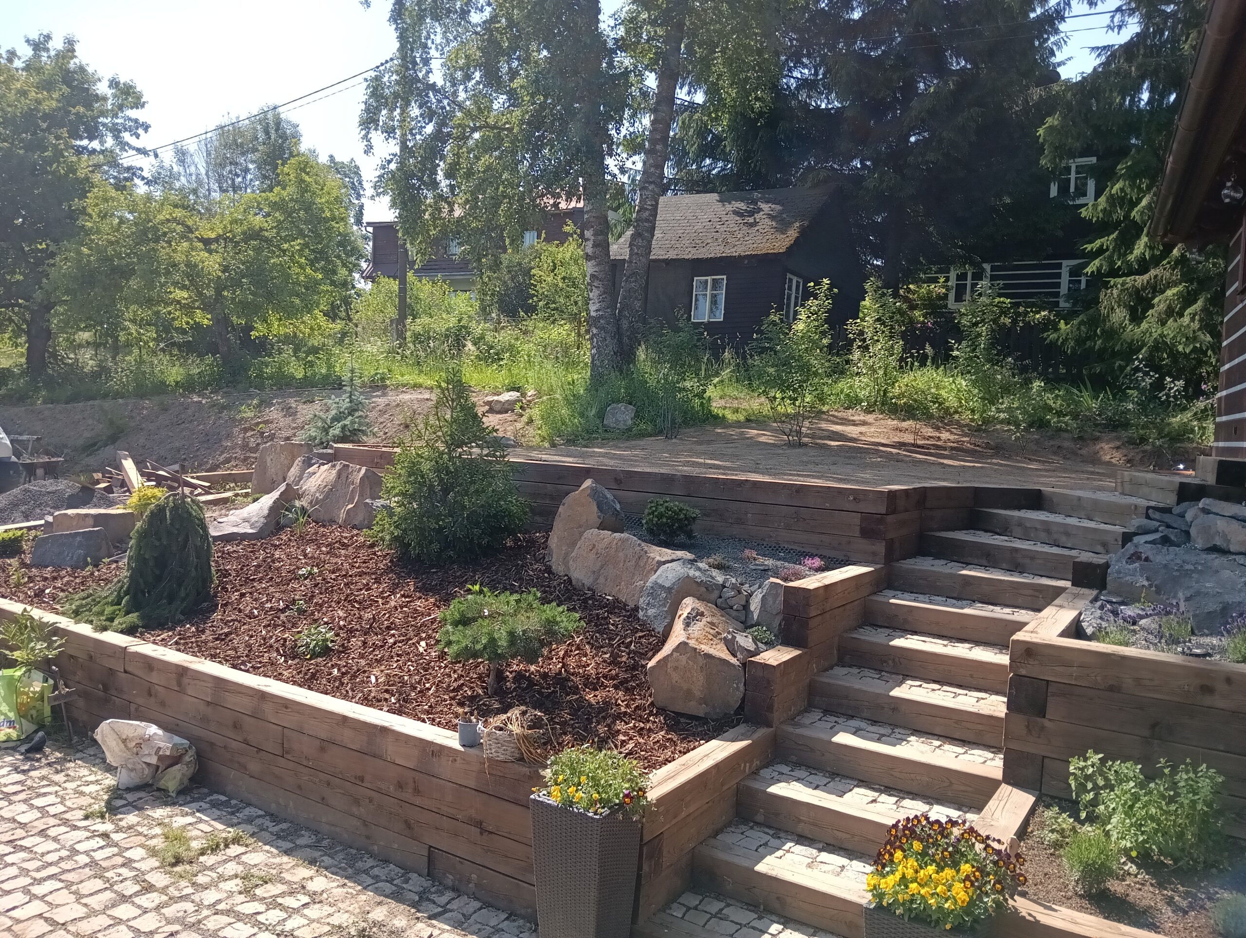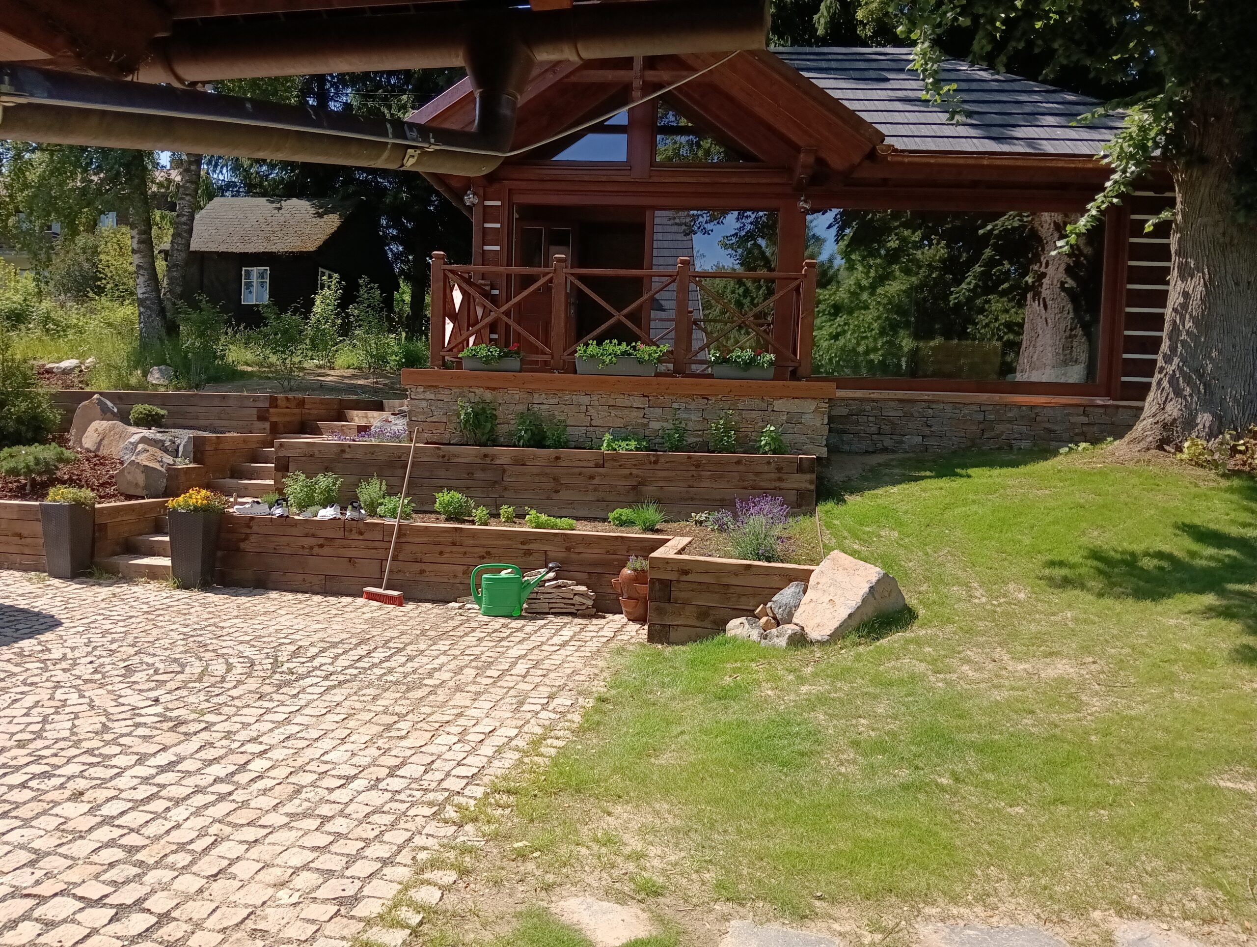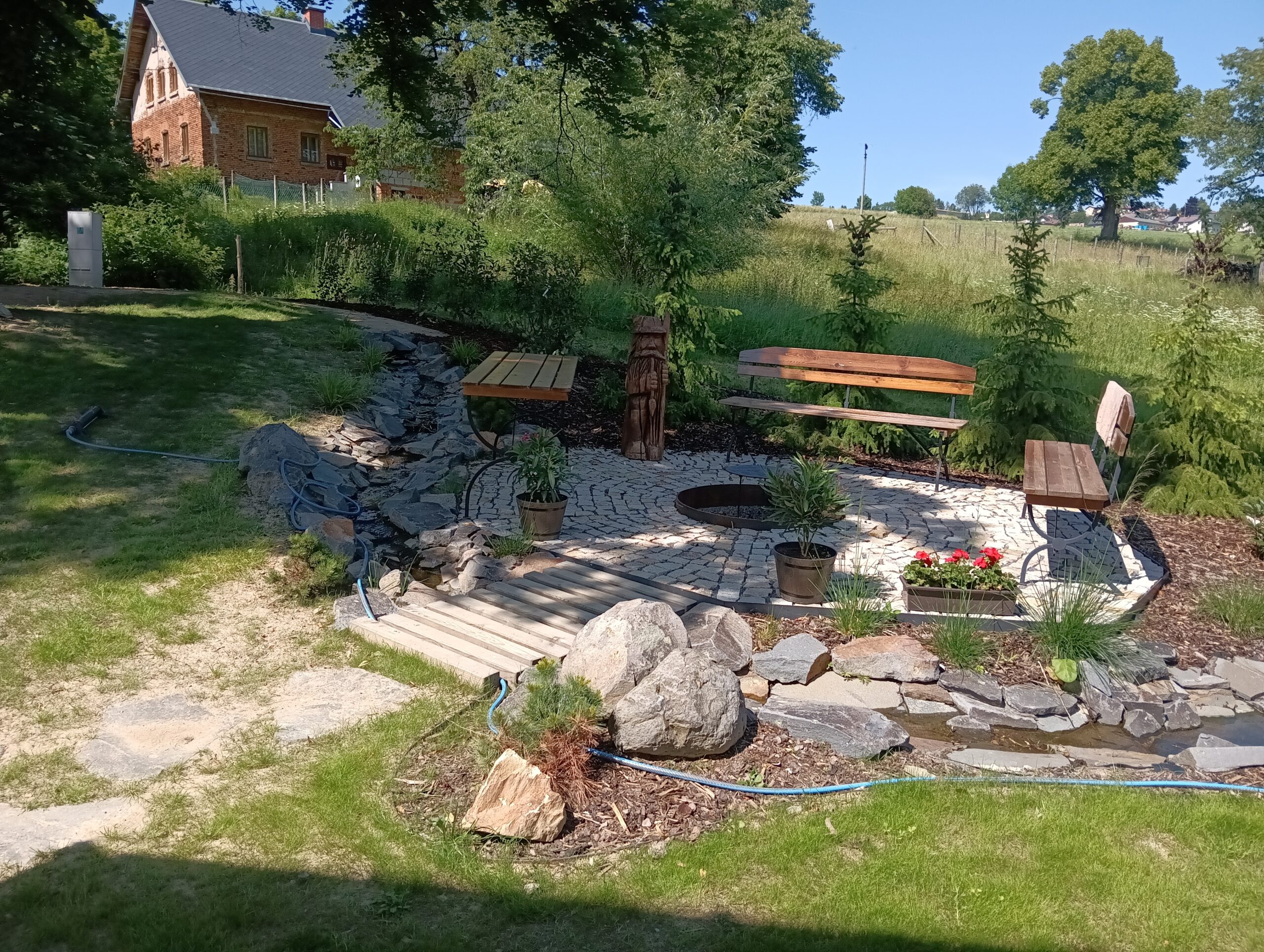Jedná se o zahradu zasazenou do prudkého kopce, kde se úrovně řešili pomocí teras, schodů a zídek. Na zahradě se vytvořilo jezírko, potůček, ovocný sad a relaxační zóna. Prudká místa, kde se nedal pohodlně pokosit trávník, byla řešena výsadbou.